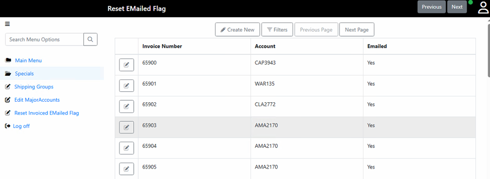 The "Reset Invoice Emailed Flag" is typically found under the CMWeb Specials menu.